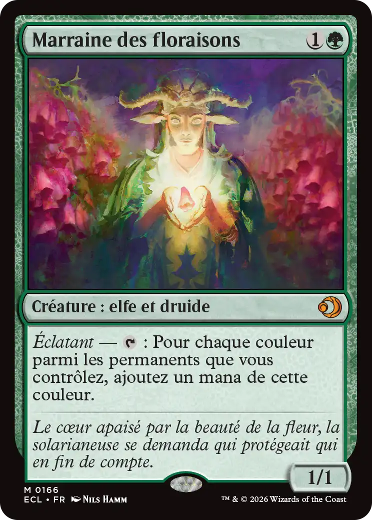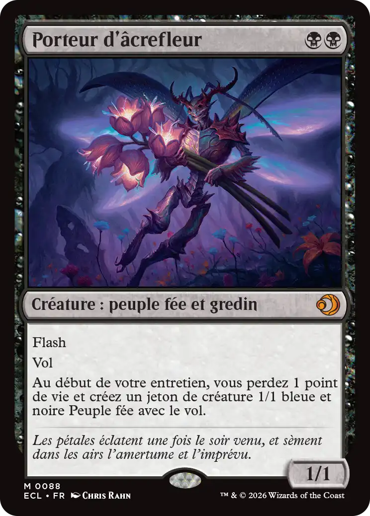 Les illustrations de Rebecca Guay ont contribué au succès du plan de Lorwyn-Sombrelande et cette dernière met à nouveau son talent au service de Lorwyn Éclipsé sur cette version sérialisée du Porteur d’âcrefleur. Numérotée et imprégnée de l'esprit des fées, cette carte est digne des hautes sphères féériques.
