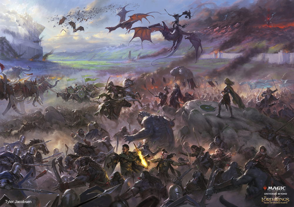 - Au troisième trimestre 2023, les joueurs pourront se rendre au Mont du Destin avec Frodon, Aragorn et le reste de la Communauté dans leur quête pour détruire l'Anneau Unique dans le set The Lord of the Rings: Tales of Middle-earth™. Les concepteurs de Magic ont dévoilé une œuvre tentaculaire illustrant la Bataille des Champs du Pelennor, la plus grande bataille de la Guerre de l'Anneau à Minas Tirith, s'étendant sur 18 cartes individuelles dans le cadre de la sortie d'un booster qui plongera les fans dans la Terre du Milieu. The Lord of the Rings: Tales of Middle-earth™ sera également disponible dans Magic: The Gathering Arena sous la forme d'un set Alchemy plus tard dans l'année.